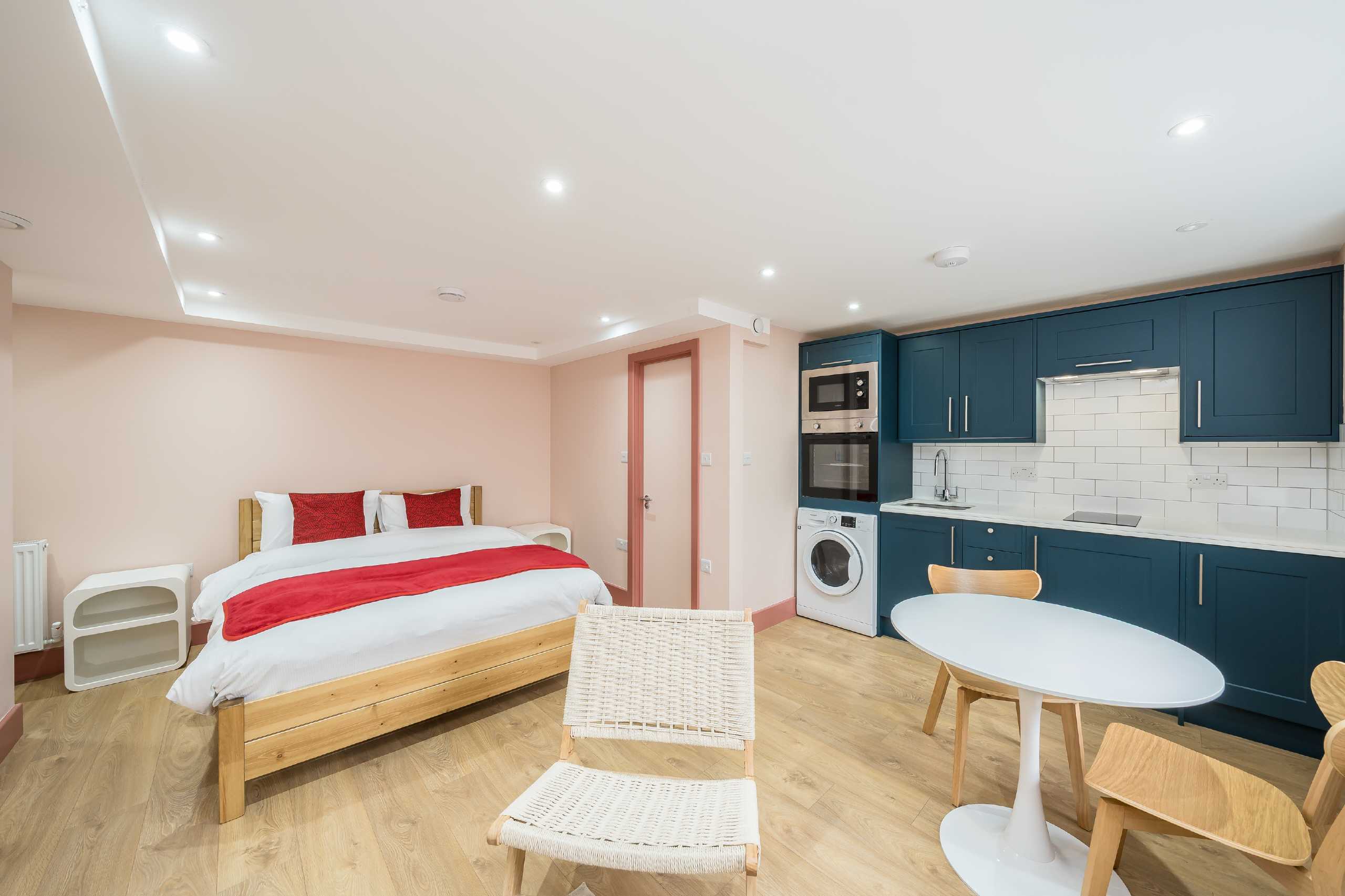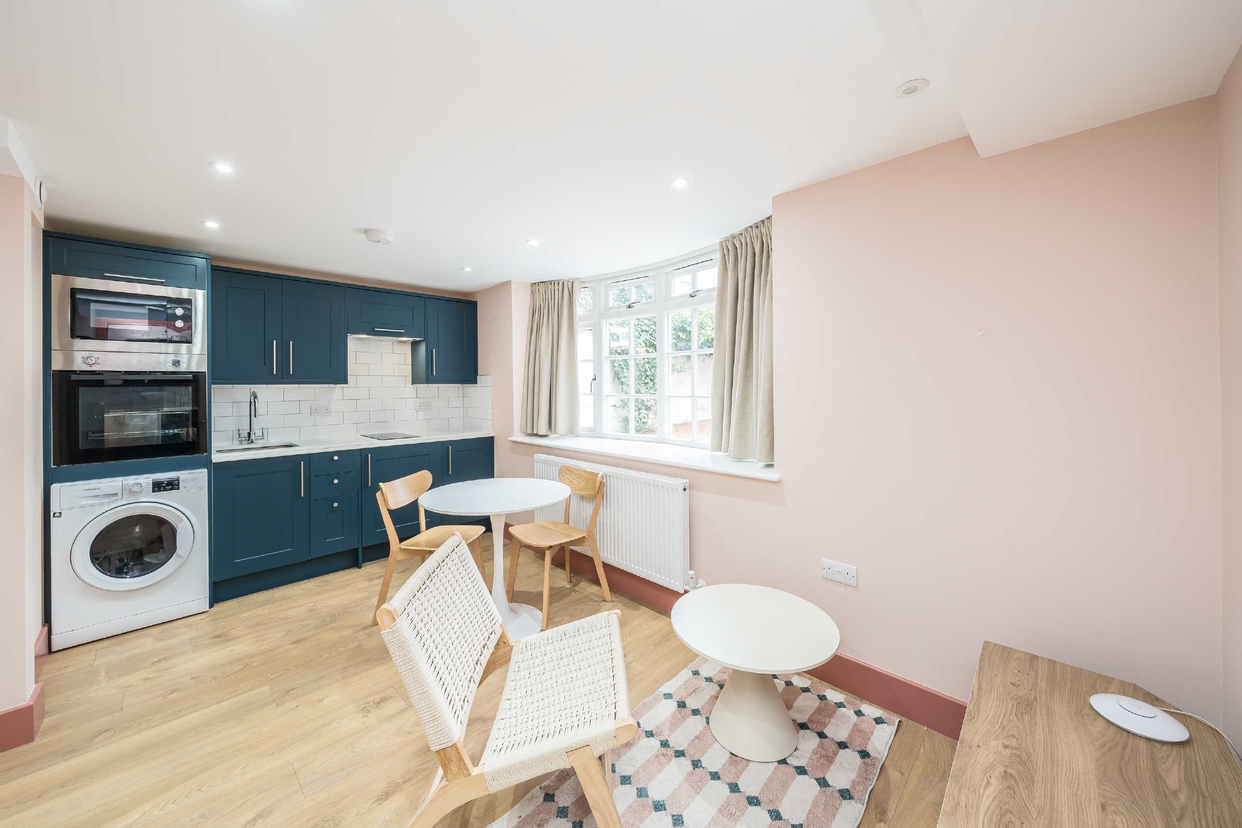 This stylish studio flat offers modern living with a contemporary kitchen and bathroom, both fitted with essential appliances and sleek fixtures. The space is furnished with elegant contemporary furniture, creating a warm and inviting atmosphere. Its open-plan layout seamlessly combines the living, sleeping, and dining areas, while generous storage adds extra practicality.