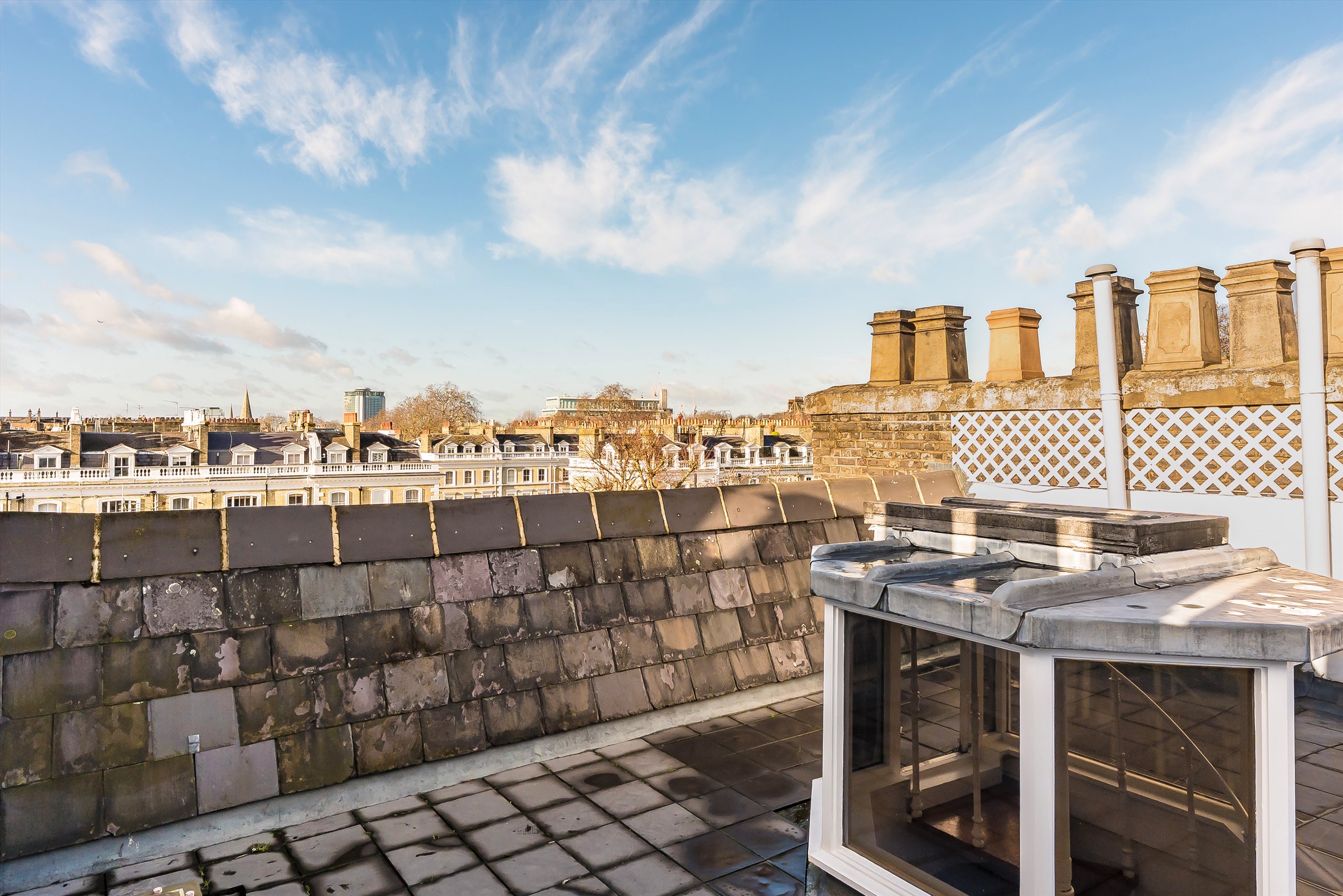 A beautifully presented three bedroom top floor flat, featuring lift access, stylish contemporary interiors, attractive communal gardens, and a superb private roof terrace.